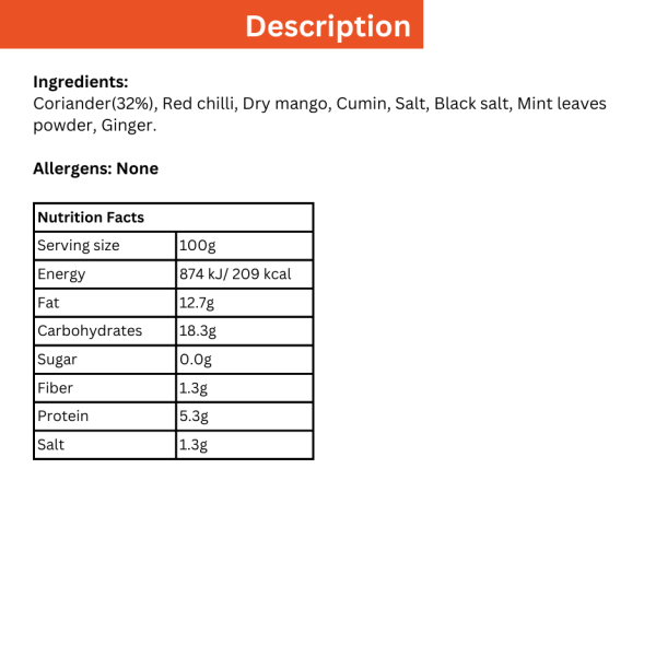 -Coriander(32%), Red chilli, Dry mango, Cumin, Salt, Black salt, Mint leaves powder, Ginger.
